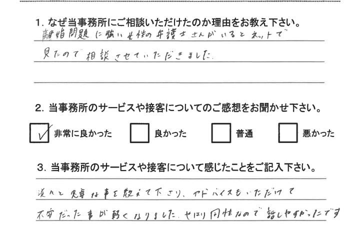 「淡々と重要な事を教えて下さり、アドバイスもいただけて不安だった事が軽くなりました。やはり同性なので話しやすかったです。」